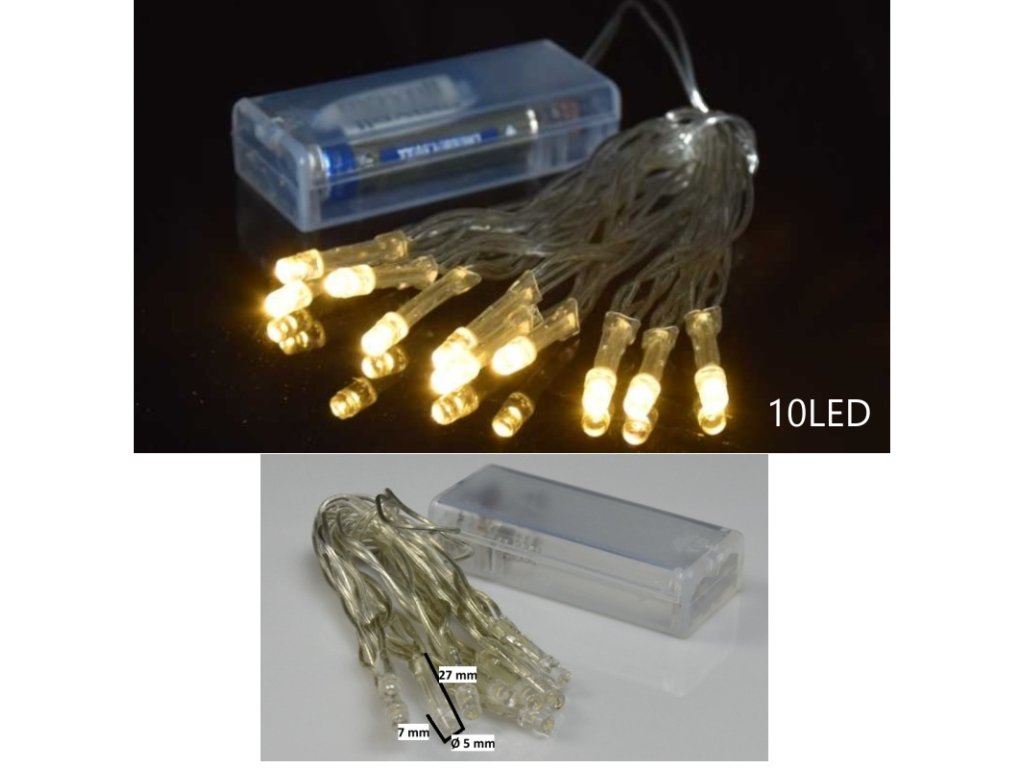 Světelný řetěz na baterie vhodný na výrobu dekorací.Barva světla: teplá bílá 10 LED 3 mm